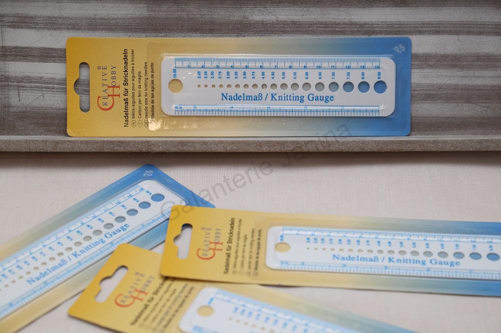 Měřítko na pletací jehlice, které pomáhá při rozlišení velikosti pletacích jehlic.