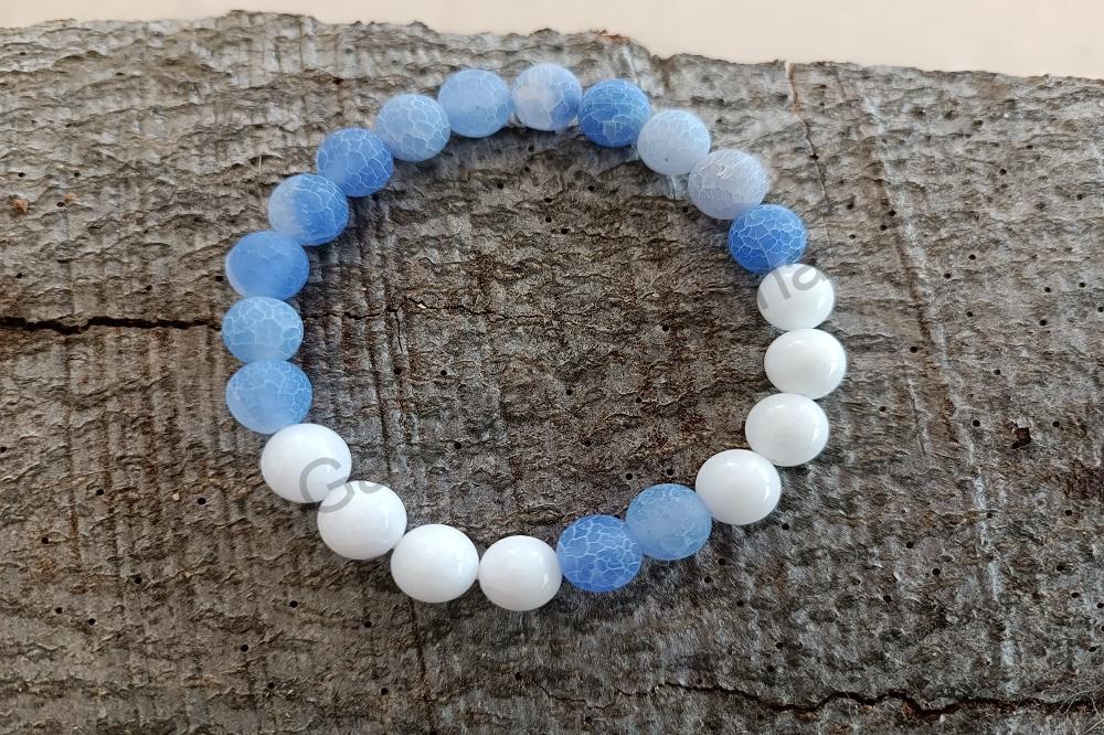 Náramek ledový achát modrý, jadeit bílý 8 mm
