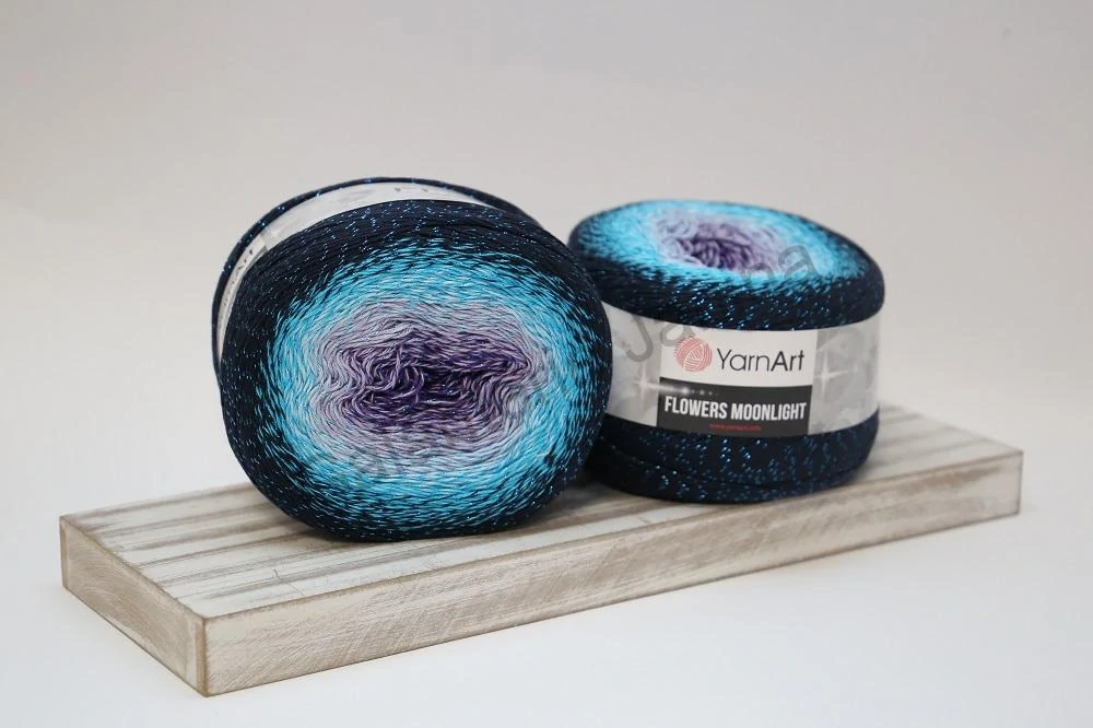 Příze Flowers Moonlight je nádherná směsová příze splétaná ze 4 nitek. Její barevné přechody – degradé – jsou středně dlouhé až dlouhé. Vlákno je doplněno o metalické vlákno, díky němuž výsledný produkt získává kouzelný třpyt.